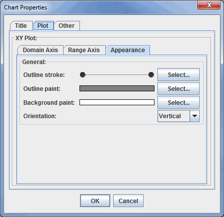 Chart Properties dialog box consists of three tabs: Title, Plot, and Other. The Plot tab includes three tabs within itself: Domain Axis, Range Axis, and Appearance.
