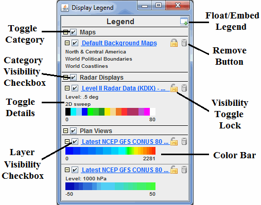 Each layer category within the Legend can be toggled to show or hide the layers under that category with the Toggle Category button. The visibility of the layers under a category (e.g., Radar Displays, Plan Views, etc.) can be changed with the Category Visibility checkbox. The visibility of an individual layer can be changed with the Layer Visibility checkbox.