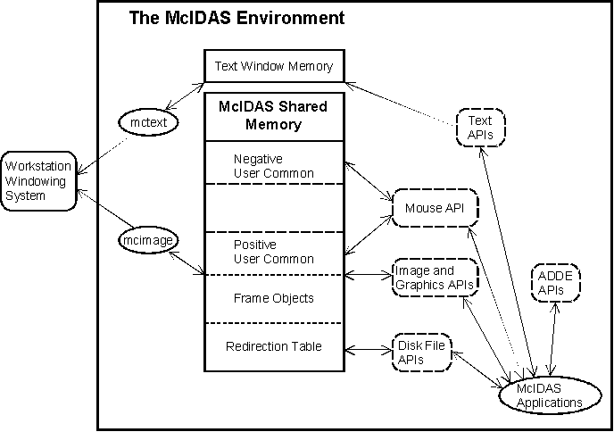 Figure 2-10 combines the three components of the McIDAS-X environment: the shared memory, resident programs and applications. The arrows represent APIs and imply the flow of data or information.
