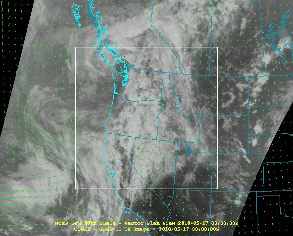 GFS model wind vectors displayed over an IR image in the western US and eastern Pacific. (Bundle)